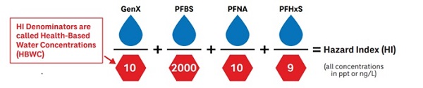 The hazard index is calculated as shown in the graphic below. If the hazard index is less than 1, then the water system complies with EPA’s draft PFAS MCL.